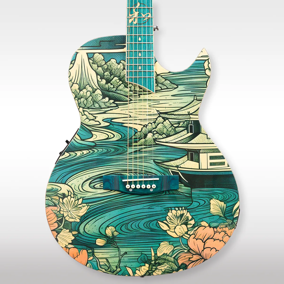 Marking our 20th anniversary, Lindo Guitars introduces the Lindo Mizumi Electro-Acoustic Guitar (“Mizumi” is the Japanese word for “Lake”). This exceptional instrument, designed in Bristol, UK, blends innovative design with traditional craftsmanship. It features a unique graphic art finish, inspired by Japanese waterscapes, and a distinctive “soaked through” fretboard adorned with a Japanese five elements inlay design. Enhancements include a side sound port for improved sonic projection, a durable composite neck, and luminating side dots for visibility in low light conditions. Combining aesthetics with functionality, the Lindo Mizumi is a testament to our commitment to excellence and innovation in guitar making.