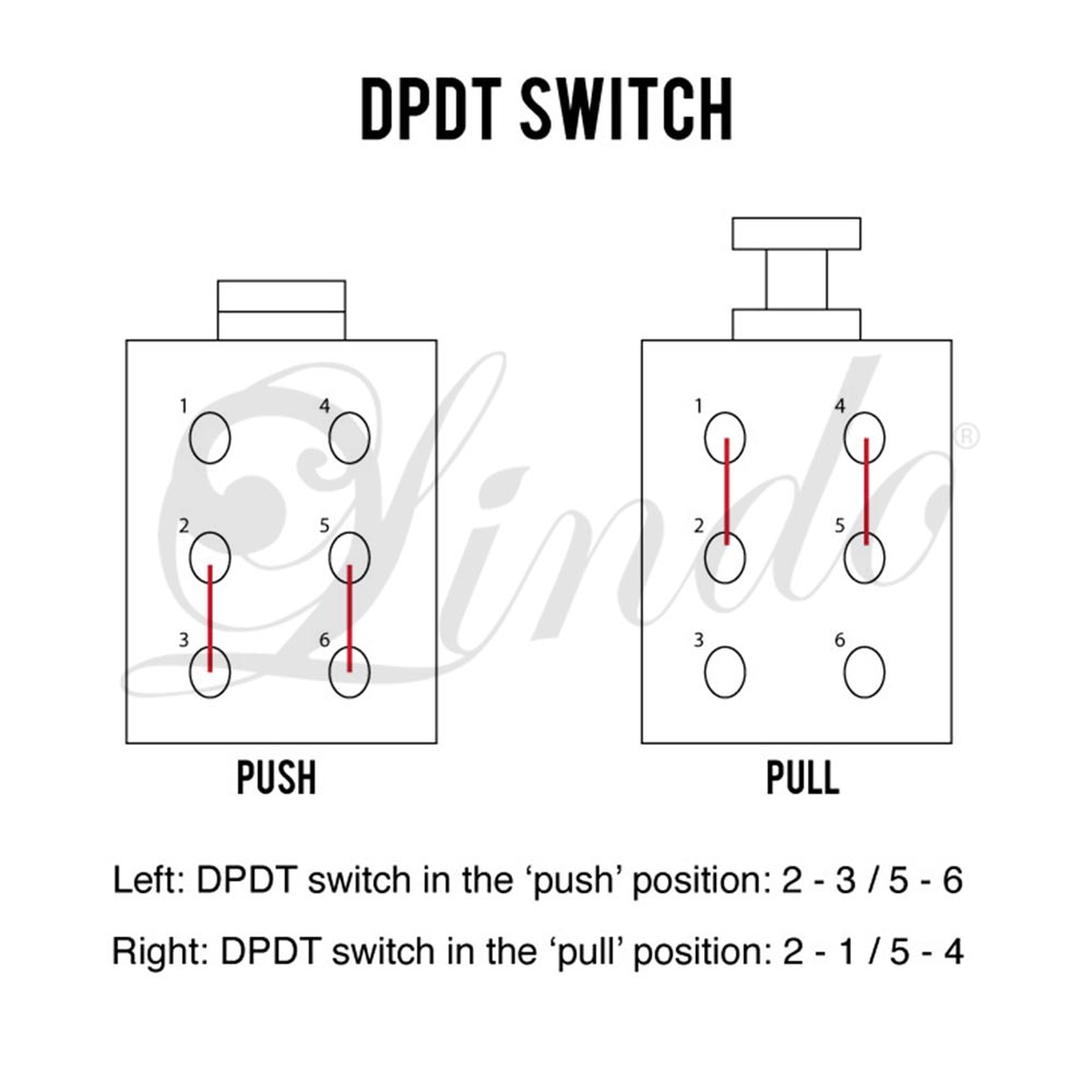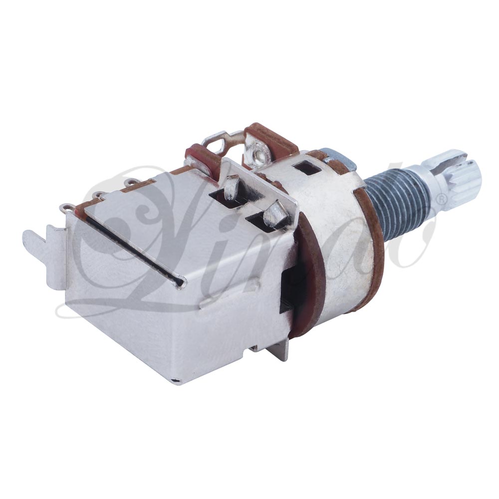 Dual-function potentiometer can be used as a normal volume or tone control, as well as a pull up to activate an on/on double-pole switch. This push pull potentiometer can control pickup phasing, series/parallel switching, coil-taps, and more.