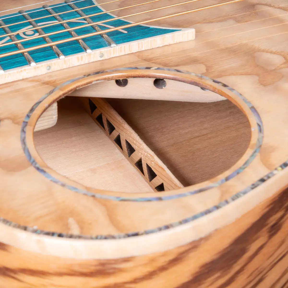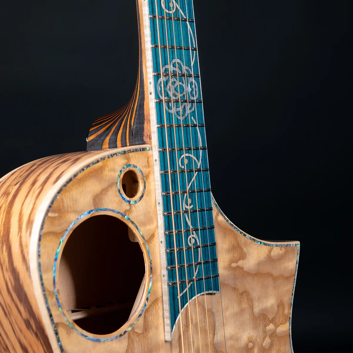The “soaked-through” teal maple fretboard and bridge add brightness to the guitar tone, as well as being reminiscent of vibrancy of a tropical ocean. The bridge’s aesthetic quality is further enhanced with brass bridge pins featuring abalone shell inlays. Brass adds clarity and punch to the tone of the strings. The fretboard’s “flora” decorative inlay, crafted in mother-of-pearl and maple wood, represents blooming flora, adding a nature-inspired elegance that’s both subtle and refined.