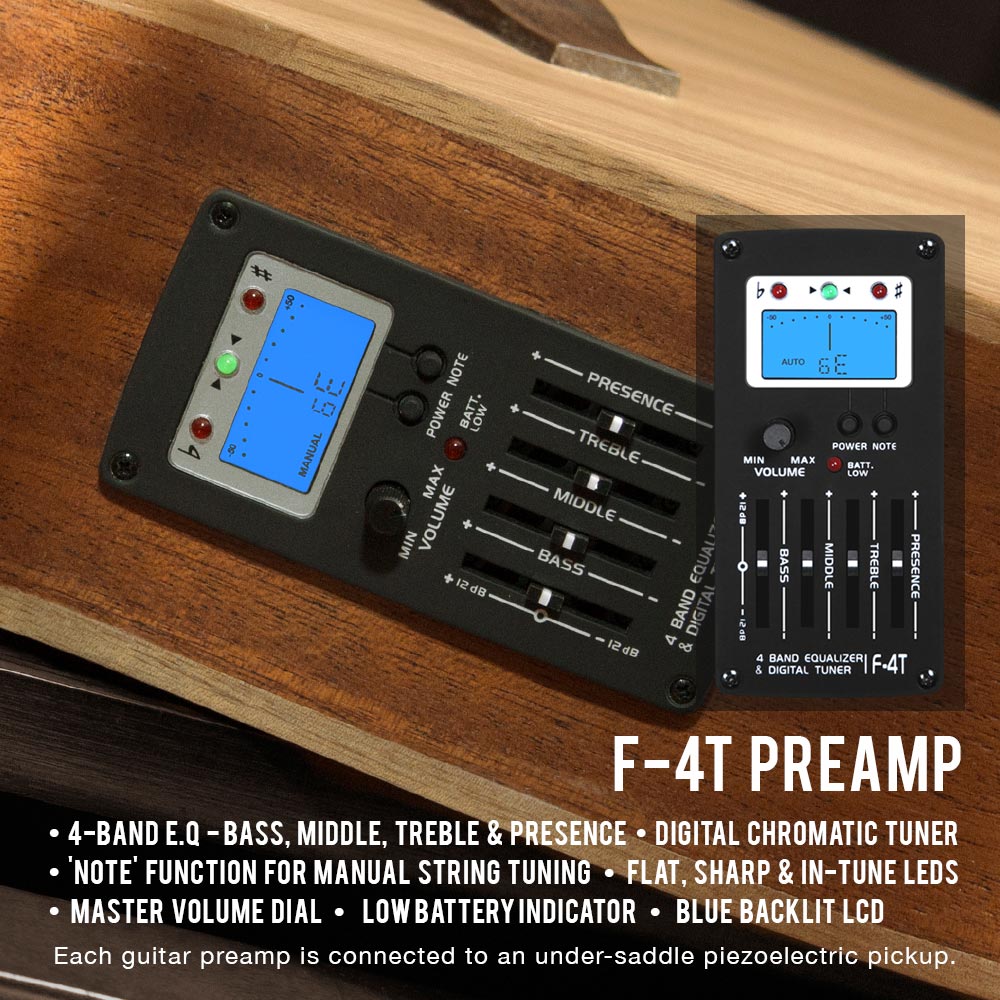 The F-4T Acoustic Guitar Preamp with a built-in digital tuner is your perfect companion for on-the-go or onstage tuning.