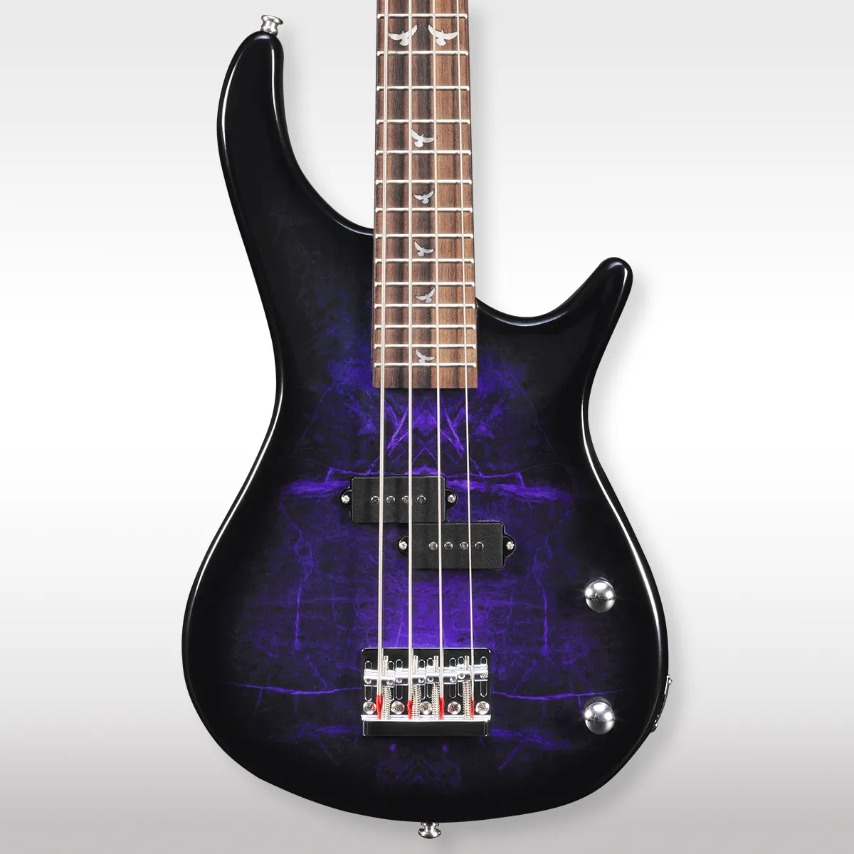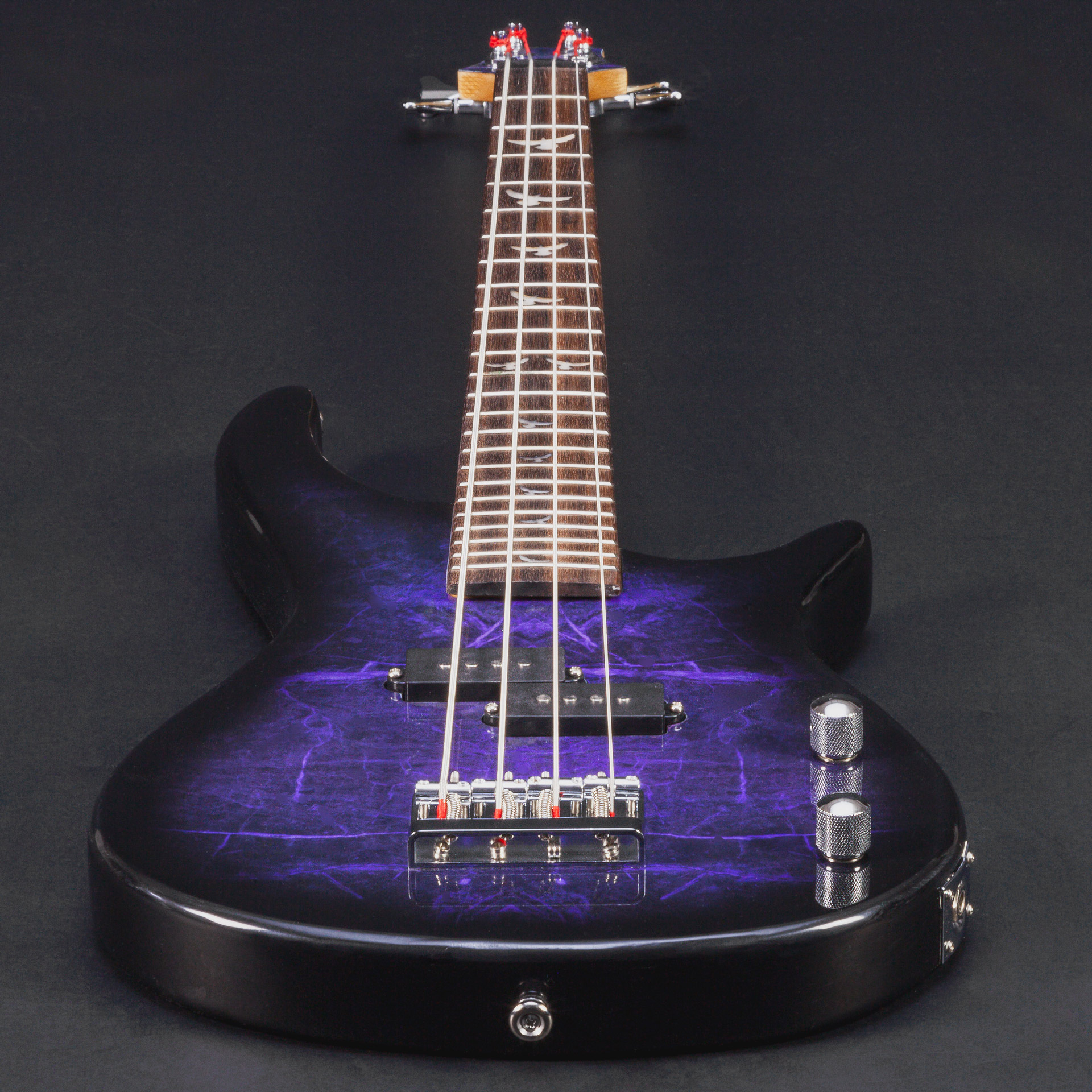 A prestige, short-scale purple p-bass with glorious dove inlays.